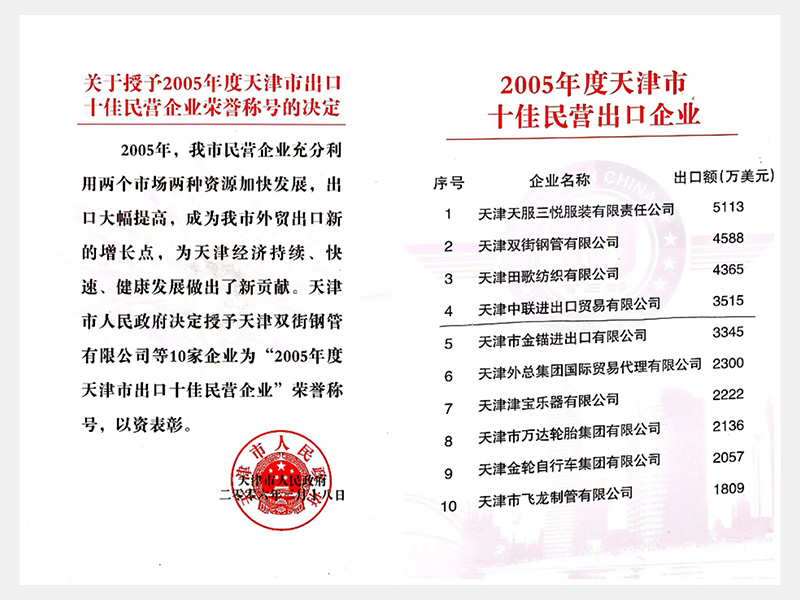 2005年度天津市十佳民營(yíng)出口企業(yè)