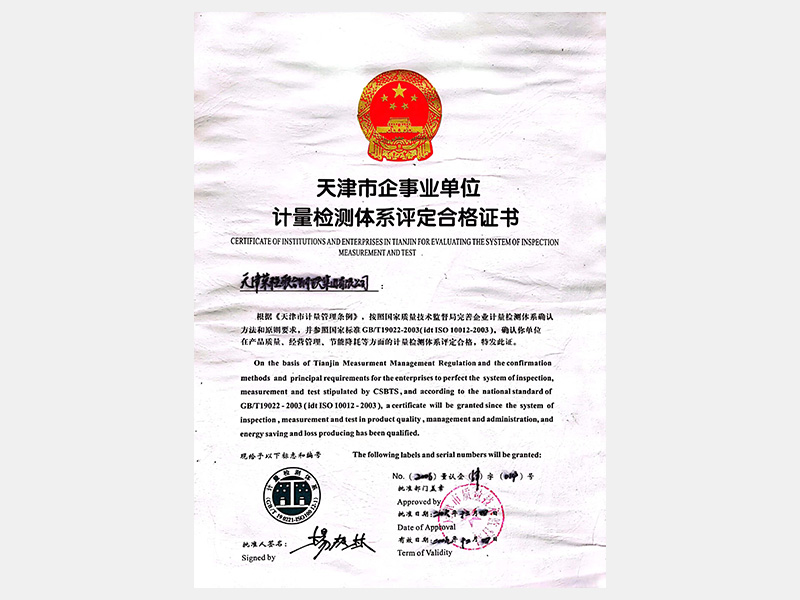 天津市企事業(yè)單位計量檢測體系評定合格證書