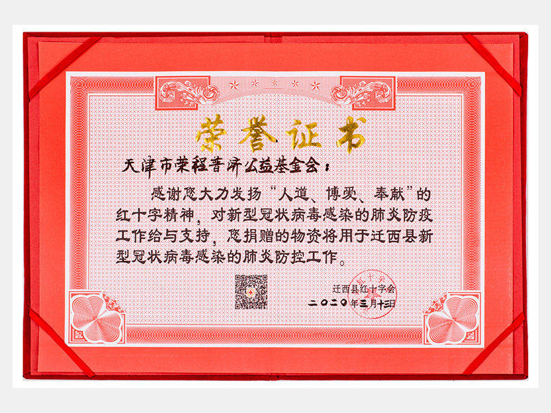 “人道、博愛、奉獻”紅十字精神-防疫物資捐贈感謝證書