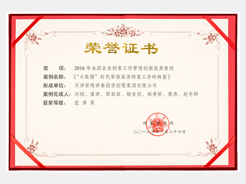 2018年全國企業(yè)檔案工作管理創(chuàng)新優(yōu)秀案例優(yōu)秀獎