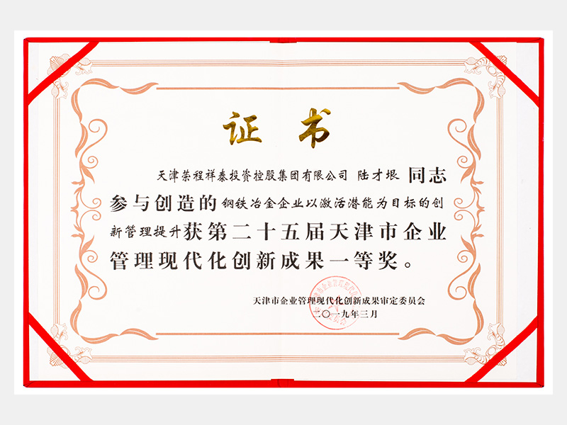 陸才垠同志參與創(chuàng)造的鋼鐵冶金企業(yè)以激活潛能為目標(biāo)的創(chuàng)新管理提升獲第二十五屆天津市企業(yè)管理現(xiàn)代化創(chuàng)新成果一等獎(jiǎng)。
